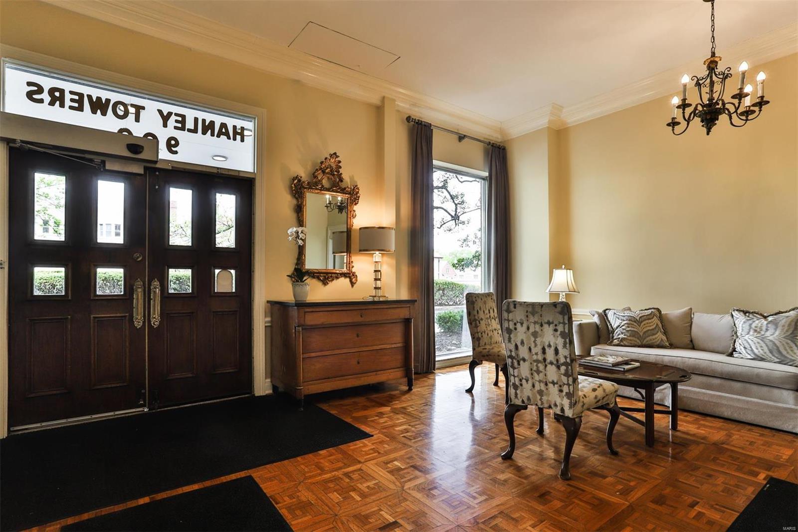 Come enjoy everything downtown Clayton living has to offer w/this 3 bed/3 bath apartment that boasts 2000 SF of living space! It features 2master bedrooms each w/walk in closets the 3rd bedroom has a large closet as well. The kitchen has been completely renovated w/granite, custom cabinets w/ soft close drawers & large breakfast bar. Original parquet floors run throughout. Large dining space flows into large living area w/stone feature wall & electric fireplace. Plenty of windows allow for a open & airy feel! stackable washer/dryer IN UNIT. The vintage chic Hanley Towers amenities include a doorman, secure building, underground parking w/ attendant, porter, FT maintenance staff, gym, lovely swimming pool, barbecue area, green space on the side of the building, professionally landscaped grounds, a small pet park. This apartment is ready for you to dress up with your own personal style! Condo requires a $500 move in fee / $500 move out fee. 1 garage spot, $75. AVAIL Janaury