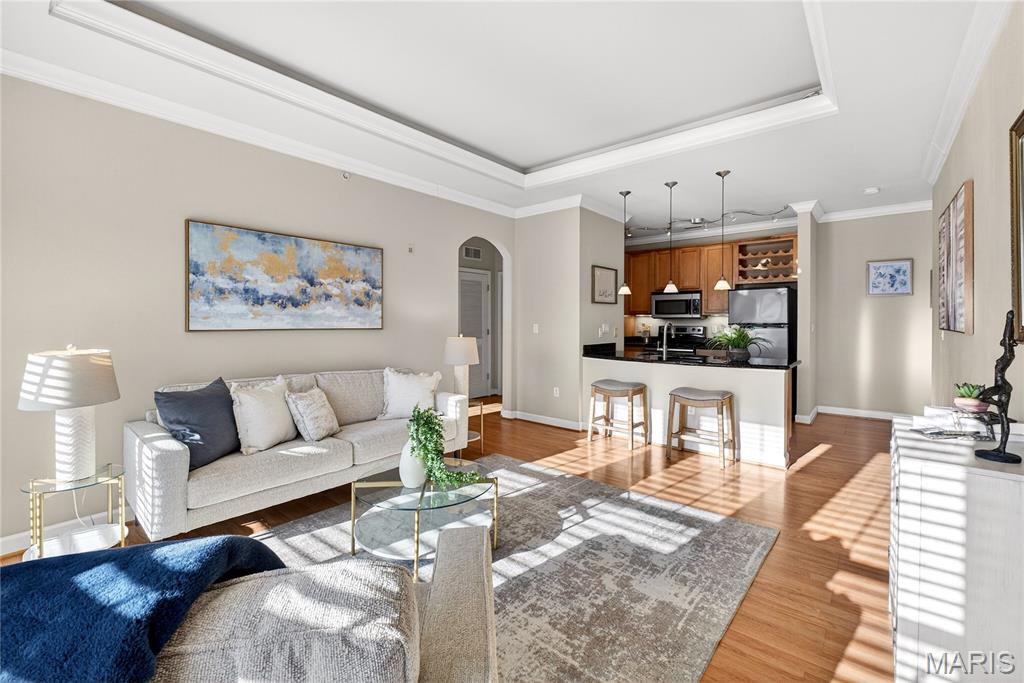 Coming Soon! Open House 1/11 from 1-3 PM! Beautiful condo in a great location! McKnight Crossing is centrally located just south of Tilles park, and walking distance to Katie's Pizza, Farrotos, as many as 14 restaurants! This condo is a must see with spacious open floor plan, 9' ceilings, crown molding, 6-panel doors, walk in closet, built in desk, in unit laundry (stack washer dryer stays), and private garage parking! The living room features wood flooring, trey ceiling, crown molding, arched doorway and is open to the designer kitchen featuring maple cabinets, granite counters, stainless steel appliances, a breakfast bar with pendant lighting, wine rack and all appliances stay! Brand new carpet in bedroom. No detail was left out this former display home. The community of McKnight Crossing is beautifully maintained with gorgeous landscaping, lighting, an inground pool, sundeck, pool house, gazebo, BBQ pits, picnic tables, community garden, bike racks and a dog park. This upscale condo puts you 15 minutes or less to anything you want to do in St. Louis located just south of Liztsinger and I-64! Perfect condo for someone looking for maintenance free living!